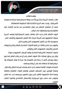 وكتب الصدر في تدوينة على موقع “إكس – تويتر سابقا”، إن “صوت الجامعات الامريكية المنادية بوقف الإرهاب الصهيوني هو صوتنا”.