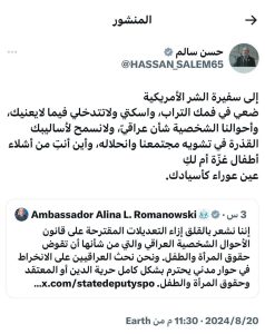 وكتب سالم، في تدوينة على موقع التواصل الاجتماعي “اكس”: “إلى سفيرة الشر الأمريكية ضعي في فمك التراب، واسكتي ولاتتدخلي فيما لايعنيك، وأحوالنا الشخصية شأن عراقيّ”.