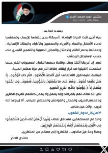 السيد الصدر: أمريكا أثبتت مدى تعطشها لدماء الاطفال والنساء والابرياء